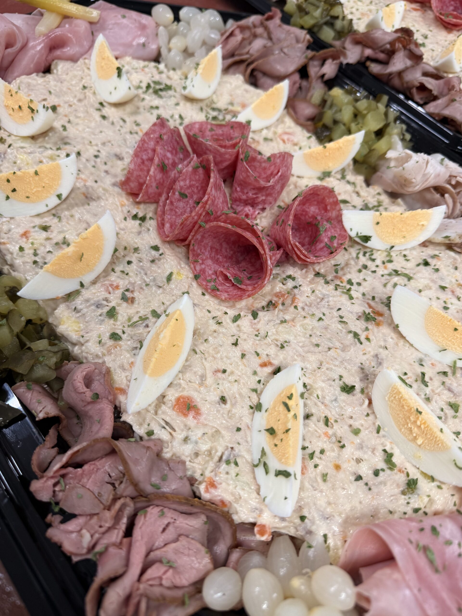 Smulsalade gemaakt van rundvlees en heeft een romige zachte smaak. De salade is opgemaakt met vleeswaren.